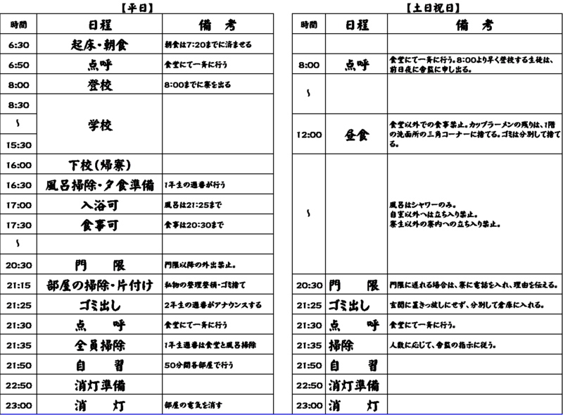○寄宿舎(寮)という集団生活の場をとおして、相互扶助・信頼と協調の精神を育成する。
