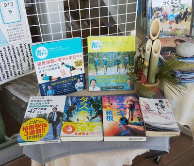 駅伝に関する小説や、今年総合優勝した青山学院大学の原監督が書かれた本や、「青トレ本」を展示しました。