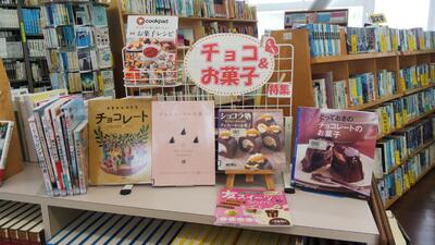 チョコレートやお菓子作りの本を展示しました。あなたも作ってみませんか?