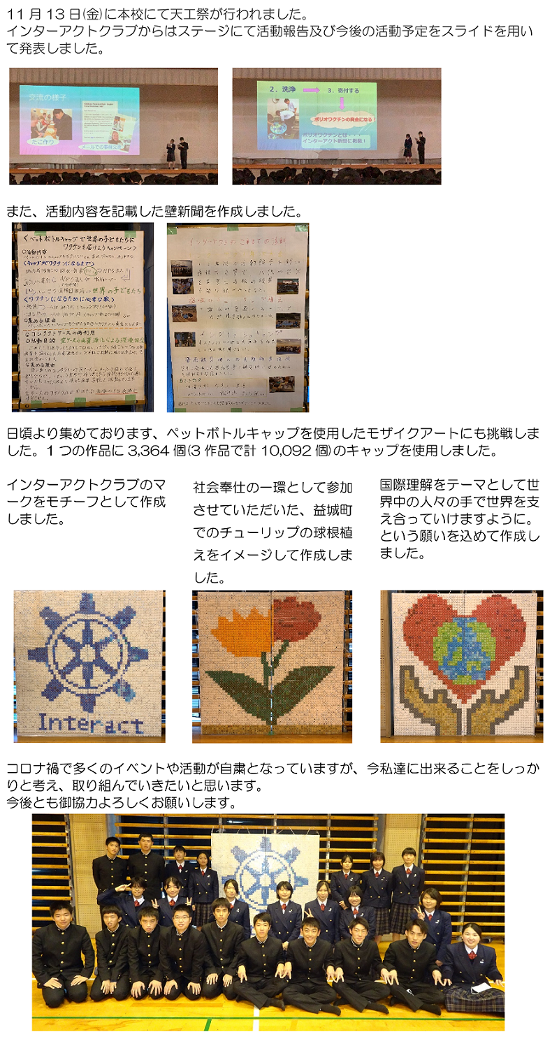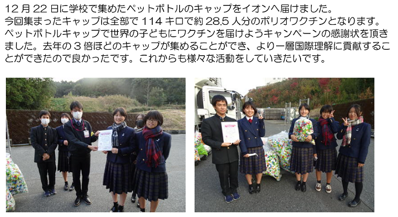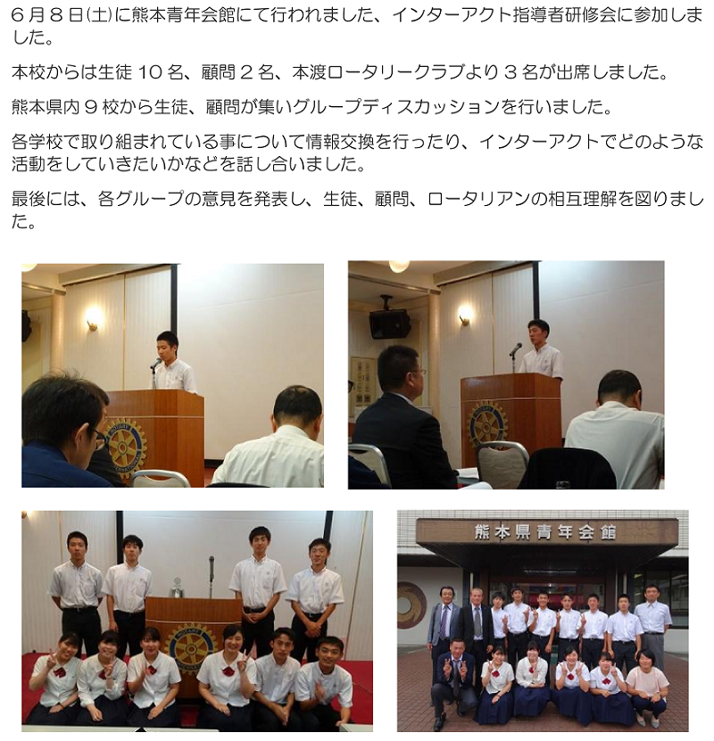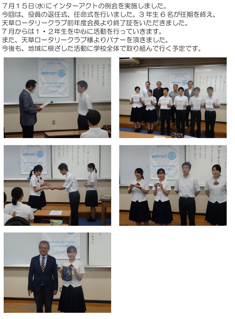インターアクトクラブの記録 全ての記事 全ての記事 カテゴリ アーカイブ 2025年12月 (0) 2025年11月 (0) 2025年10月 (0) 2025年9月 (0) 2025年8月 (0) 2025年7月 (0) 2025年6月 (0) 2025年5月 (0) 2025年4月 (0) 2025年3月 (0) 2025年2月 (0) 2025年1月 (0) 2024年12月 (0) 2024年11月 (0) 2024年10月 (0) 2024年9月 (0) 2024年8月 (0) 2024年7月 (0) 2024年6月 (0) 2024年5月 (0) 2024年4月 (0) 2024年3月 (0) 2024年2月 (0) 2024年1月 (0) 2023年12月 (0) 2023年11月 (0) 2023年10月 (0) 2023年9月 (0) 2023年8月 (0) 2023年7月 (0) 2023年6月 (0) 2023年5月 (0) 2023年4月 (0) 2023年3月 (0) 2023年2月 (0) 2023年1月 (0) 2022年12月 (0) 2022年11月 (1) 2022年10月 (0) 2022年9月 (0) 2022年8月 (1) 2022年7月 (0) 2022年6月 (2) 2022年5月 (0) 2022年4月 (1) 2022年3月 (0) 2022年2月 (0) 2022年1月 (1) 2021年12月 (2) 2021年11月 (4) 2021年10月 (1) 2021年9月 (2) 2021年8月 (2) 2021年7月 (3) 2021年6月 (3) 2021年5月 (1) 2021年4月 (3) 2021年3月 (2) 2021年2月 (2) 2021年1月 (3) 2020年12月 (2) 2020年11月 (2) 2020年10月 (0) 2020年9月 (0) 2020年8月 (0) 2020年7月 (2) 2020年6月 (0) 2020年5月 (0) 2020年4月 (0) 2020年3月 (0) 2020年2月 (0) 2020年1月 (0) 2019年12月 (0) 2019年11月 (2) 2019年10月 (1) 2019年9月 (0) 2019年8月 (0) 2019年7月 (1) 2019年6月 (2) 2019年5月 (0) 2019年4月 (0) 2019年3月 (1) 2019年2月 (0) 2019年1月 (1) 50件 1件 5件 10件 20件 50件 100件 【インターアクトクラブ】服のチカラプロジェクト活動について 投稿日時 : 2022/11/29 作成者2 【インターアクトクラブ】第38回年次大会が行われました。 投稿日時 : 2022/08/01 作成者2 【インターアクトクラブ】まちはみんなの遊園地6月期 投稿日時 : 2022/06/20 学校サイト管理者 【インターアクトクラブ】ペットボトルキャップをイオンへ 投稿日時 : 2022/06/03 学校サイト管理者 【インターアクトクラブ】全国大会に参加 投稿日時 : 2022/04/25 学校サイト管理者 【インターアクトクラブ】1月19日の活動報告 投稿日時 : 2022/01/20 学校サイト管理者 【インターアクトクラブ】まちはみんなの遊園地12月期 投稿日時 : 2021/12/20 学校サイト管理者 【インターアクトクラブ】12月8日の活動報告 投稿日時 : 2021/12/08 学校サイト管理者 【インターアクトクラブ】まちはみんなの遊園地11月期 投稿日時 : 2021/11/22 学校サイト管理者 【インターアクトクラブ】11月10日の活動報告 投稿日時 : 2021/11/11 学校サイト管理者 【インターアクトクラブ】11月2日の活動報告 投稿日時 : 2021/11/02 学校サイト管理者 【インターアクトクラブ】服のチカラプロジェクト! 投稿日時 : 2021/11/01 学校サイト管理者 【インターアクトクラブ】まちはみんなの遊園地10月期 投稿日時 : 2021/10/25 学校サイト管理者 【インターアクトクラブ】9月15日の活動報告 投稿日時 : 2021/09/17 学校サイト管理者 【インターアクトクラブ】RKKラジオ取材 投稿日時 : 2021/09/17 学校サイト管理者 【インターアクトクラブ】オリジナルスタンプの製作 投稿日時 : 2021/08/20 学校サイト管理者 【インターアクトクラブ】ペットボトルキャップをイオンへ 投稿日時 : 2021/08/10 学校サイト管理者 【インターアクトクラブ】まちはみんなの遊園地7月期 投稿日時 : 2021/07/21 学校サイト管理者 【インターアクトクラブ】新旧交代式修了証書の授与 投稿日時 : 2021/07/14 学校サイト管理者 【インターアクトクラブ】まちはみんなの遊園地7月期も参加します! 投稿日時 : 2021/07/14 学校サイト管理者 【インターアクトクラブ】天草市市政だより9月号特集記事企画に参加 投稿日時 : 2021/06/23 学校サイト管理者 【インターアクトクラブ】まちはみんなの遊園地6月期 投稿日時 : 2021/06/22 学校サイト管理者 【インターアクトクラブ】SDGs学習会 投稿日時 : 2021/06/10 学校サイト管理者 【インターアクトクラブ】ペットボトルキャップをイオンへ 投稿日時 : 2021/05/06 学校サイト管理者 【インターアクトクラブ】4月21日の活動報告 投稿日時 : 2021/04/22 学校サイト管理者 【インターアクトクラブ】まちはみんなの遊園地4月期 投稿日時 : 2021/04/20 学校サイト管理者 【インターアクトクラブ】4月7日の活動報告 投稿日時 : 2021/04/08 学校サイト管理者 【インターアクトクラブ】まちはみんなの遊園地3月期 投稿日時 : 2021/03/22 学校サイト管理者 【インターアクトクラブ】3月17日の活動報告 投稿日時 : 2021/03/18 学校サイト管理者 【インターアクトクラブ】2月24日の活動報告 投稿日時 : 2021/02/24 学校サイト管理者 【インターアクトクラブ】絵馬及び焼き印の贈呈式 投稿日時 : 2021/02/08 学校サイト管理者 【インターアクトクラブ】1月27日の活動報告 投稿日時 : 2021/01/27 学校サイト管理者 【インターアクトクラブ】天草Asovivaプロジェクトの方々との会議 投稿日時 : 2021/01/21 学校サイト管理者 【インターアクトクラブ】1月20日の活動報告 投稿日時 : 2021/01/21 学校サイト管理者 【インターアクトクラブ】ペットボトルキャップをイオンへ 投稿日時 : 2020/12/23 学校サイト管理者 【インターアクトクラブ】12月23日の活動報告 投稿日時 : 2020/12/23 学校サイト管理者 【インターアクトクラブ】イルミネーション高校生企画 投稿日時 : 2020/11/24 学校サイト管理者 【イ