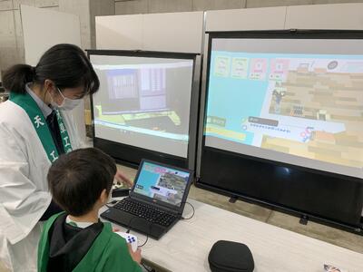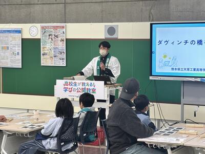 小中学生向け公開教室である「高校生が教える!学びの公開教室」ではCG系列の生徒が作ったゲームで遊んだり、割りばしで「ダヴィンチの橋」を作るなどして、小中学生と交流を深めることができました。
