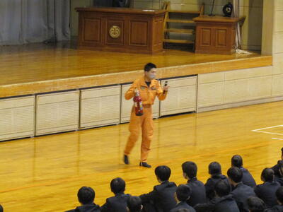 警報後、全生徒静かに速やかに体育館に避難しました。消防訓練として、天草広域連合中央消防署の小林様から消火器の使い方のレクチャーが行われました。消火器を使用すると消火剤が舞い、周りが見えなくなるため、避難経路が見にくくなることがあるそうです。避難経路を背中に向けて消火器を使用するのが望ましいとのことでした。また、ハンカチで口元を押さえる生徒が少なかった点を指摘されました。火事で命を落とす原因は、煙や有毒ガスを吸い込むことで意識を失ってしまうことだそうです。ハンカチは常に携行しておきましょう。