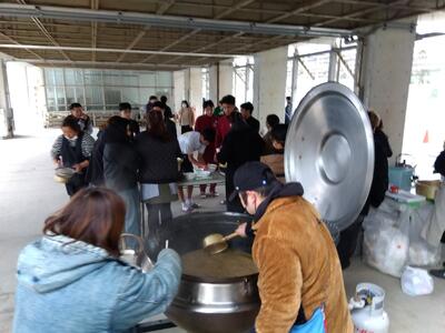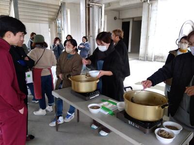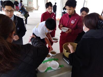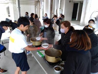 ゴールした生徒から順に、育友会の方々に作っていただいた豚汁を受け取り、おいしくいただきました。