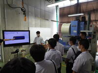 井関熊本製造所では、企業概要について説明を受け、製造現場で組立の工程を見学しました。溶接ロボットや学校のものより大きい数値制御工作機械など生徒は驚いていました。また、製品の展示ブースでは歴史や大型コンバインの体験をすることができました。