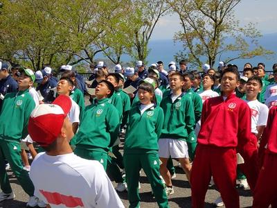 1年生に向けて、2、3年生が「校訓唱和」そして、「校歌斉唱」を披露します。体を大きく仰け反り、全力で声を出します。先輩達の堂々たる姿に、1年生の気持ちも引き締まります。