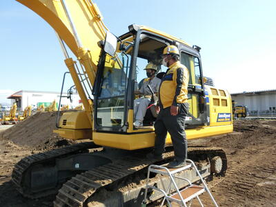 コマツIoTセンタ九州では最新のICT建機について教えていただいた後、実際の建機を体験させてもらいました。