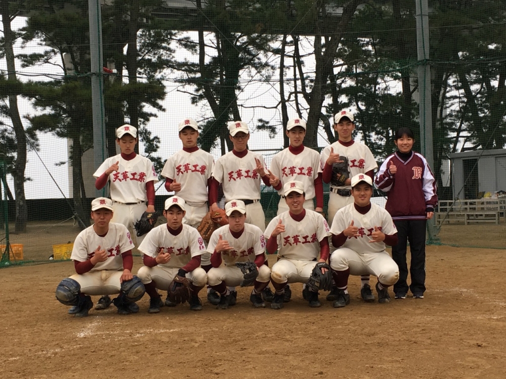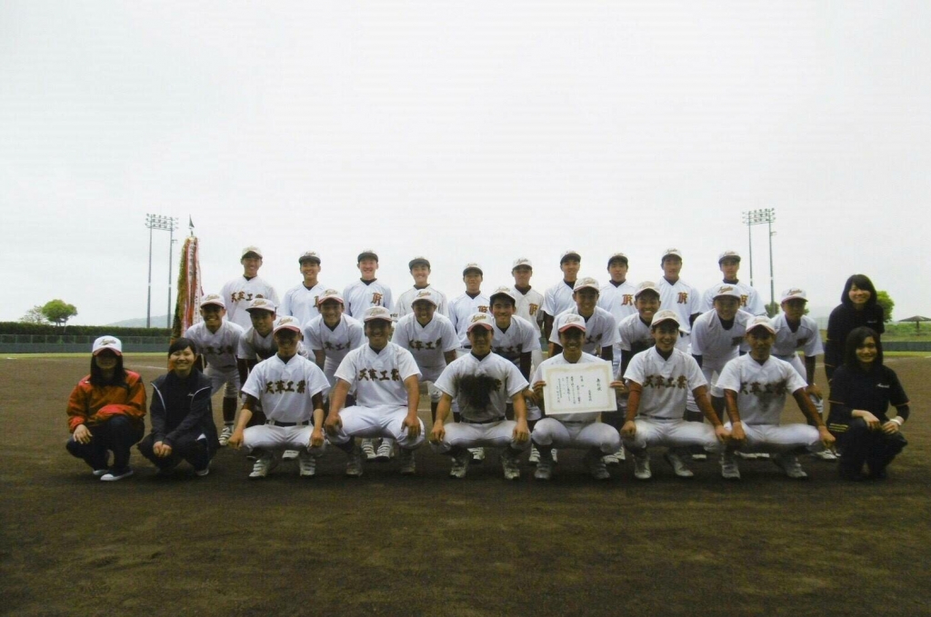 5月6日に行われた天草地区大会の決勝は牛深高校との対戦でした。ゴールデンウィーク前から天草工業高校でもインフルエンザが流行し、部員の12名が欠席の中での試合となりました。先発ピッチャーは機械科2年生の野嶋君。打たせて取るピッチングで9回2安打の好投をすることができました。攻撃は少ないチャンスをものにし、見事2対0で優勝することができました。今後は夏の大会に向けて部員一同気を引き締めて頑張っていきたいと思います。