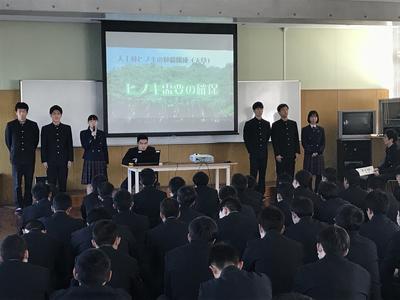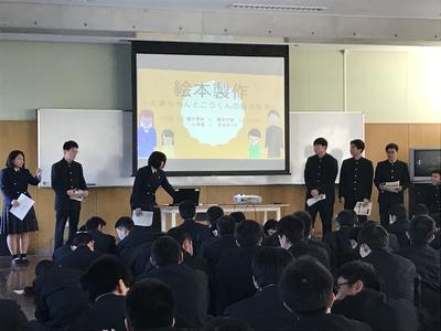 本年度は、コロナ感染を考慮してリモートでの発表会とし、1年生、2年生、3年生のA・B組、それぞれが別室での視聴となりました。初の試みでもありましたが、皆真剣に発表の様子を見ていました。
