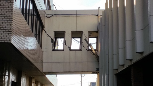 贈呈式では、熊本県の工業系学校12校が製作した17台のリアカーを熊本県高等学校教育研究会工業部会会長をはじめ、製作した生徒の代表2人も参加し、益城町の西村町長様にお渡しすることが出来ました。写真は益城町役場の旧庁舎ですが、被災地にはいまだ熊本地震の傷跡が深く残り、継続的な支援の必要性を強く感じました。製作したリアカーが復興の一助となれば幸いです。【機械科】であいふれあいフェスタでくまモン号体験乗車を行いました