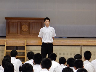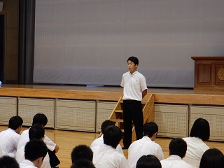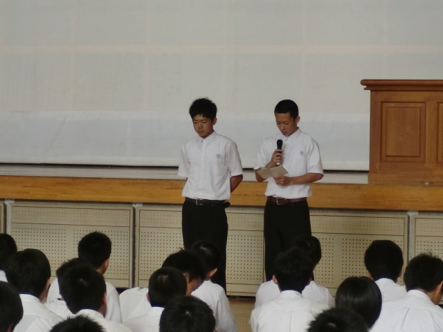 朝課外の時間を利用して科集会を行いました。今回はM3Bの代表者が内容を考えて実行してくれました。主な内容としては服装検査について、朝課外に取り組む姿勢について、総体後の切り替えについて、期末テストに向けてというものでした。最後に校歌を歌って終了の予定でしたが、2年生がしっかり歌えていないということでもう一度歌いました(^^;)