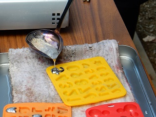 今年度の機械科2年生はA組・B組合同でキーホルダーの製作を行っています。比較的低温で溶ける金属を溶かして、型に入れて固めるという鋳造作業を体験することができます。型はアルファベットや数字、動物の形やハート形など色々準備しています!ぜひやってみて下さい(^_-)