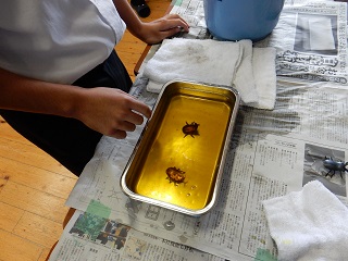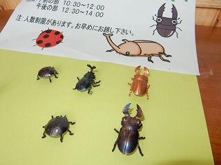 M1AがM3Aの教室にて昆虫のミニチュア製作を行っています。金属の薄い板をハンマーでたたいたり、ペンチで折り曲げたりしながら形作っていくというものです。小さなお子さんから大人の方まで様々な方々に作っていただいていますよ~♪テントウムシとカブトムシとクワガタから選んで作っていただいています。板の枚数に限りがありますので、お早めにご参加ください!午後の部は12:30から開催の予定です(^^)/