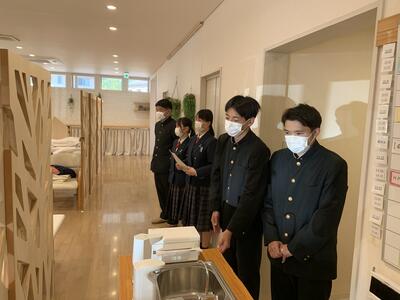 ↑実際には5人の班ですが最小限の人数で訪問いたしました。真剣に話を聞いたり質問しています。