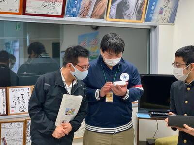 天草営業所所長 芥川様、メディア事業部ラジオ製作課 植田様 が応対して下さり、トロフィーや製作したラジオを手に取り大変喜んでいらっしゃいました。