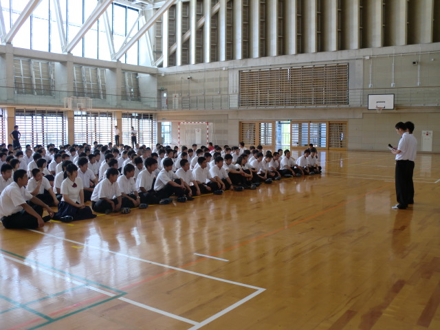 朝課外の時間を利用して科集会を行いました。今回はM3Bの代表者が内容を考えて実行してくれました。主な内容としては服装検査について、朝課外に取り組む姿勢について、総体後の切り替えについて、期末テストに向けてというものでした。最後に校歌を歌って終了の予定でしたが、2年生がしっかり歌えていないということでもう一度歌いました(^^;)