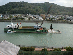 学校の裏の運河(瀬戸海峡)に掘削船が来ていました。多分、海底に積もった泥を掻き揚げて、水深を確保する工事をしているのだろうと思われます。考査(一昨日から期末考査です)が終わって下校時に、普段見慣れない大型の掘削船を見て「何だろう(?_?)」と思った生徒も多かったかもしれません。