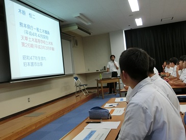県庁土木部道路整備課から木原様をお招きし、くまもと未来への復興人材育成事業としてお話をしていただきました。