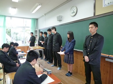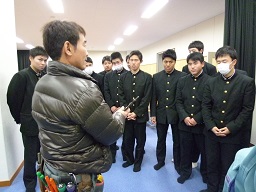 就職内定、そして高専編入が決まった電気科3年生が、後輩(2年生、1年生)に進路体験談をしてくれました。これまでの勉強方法や、会社の仕事内容、面接ではどんなことを聞かれたのかなどのアドバイスがありました。2年生、1年生は真剣な眼差しで聞いていました。 |