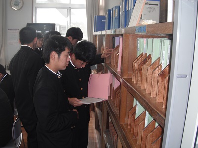 2年生の質問では「試験前日はどのような気持ちでしたか?」「資格は何個持っておられますか?」「履歴書を書くうえで気をつけたことはありますか?」など普段質問できない事を聞いていました。その後、求人票を置いてある進路コーナーへ行き、どのような会社の求人があるか興味を持ち、熱心に調べていました。