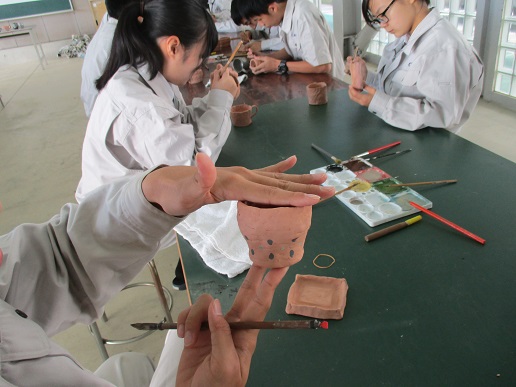 来ていただき、作った作品に絵付けをしました。生徒達は、色の付け方などを教えていただきながら、そ