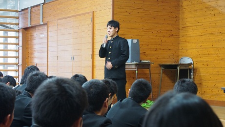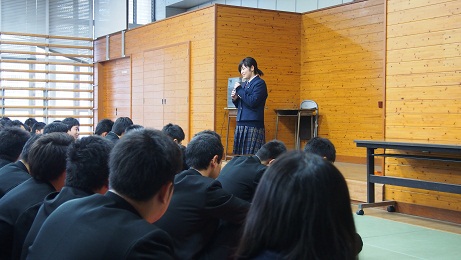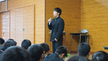 今日は3年生の進路体験報告をしてもらいます。M3Aが2人、M3Bが3人の合計5名ですが、就職が4名で進学が1名です。よく話を聞き、1,2年生はこれからどのような準備をしたらよいかを考え、3年生はほとんどの進路が決定している中で、自分達がこれまでどのように努力をしてきたか思い返し、残った卒業までの期間に何をするべきか考える機会にして欲しいと思います。