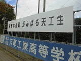 学校横の国道から見える学校PR用掲示板の合板が劣化していたため、新年を前に改修しました。掲示物が無いときに白地で寂しい感じがしたので、天工の目標である「果敢な挑戦」という言葉を描きました。年末、年始で帰省される卒業生や国道を通る方々向けPRとして、1225日現在の進路決定状況を印刷し掲示しました。寒い中、生徒が手伝ってくれ、2日間で完成させました。天草工業のことを少しでも知ってもらえたらと願っています。
