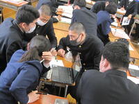 図書の田中先生にご協力いただきながら、図書館やタブレット端末を利用してディベートに必要な資料を収集しました。今回は、朝日新聞社が提供している記事検索サイト「朝日けんさくくん」をお試し期間として利用することができ、効果的に新聞記事を活用することが出来ました。3月15~17日の授業で実践発表を行い、担任の先生や他教科の先生方にも観覧いただきました。