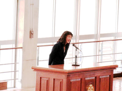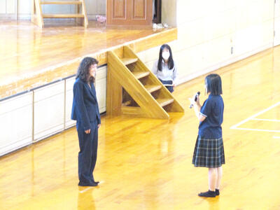 2学期から新しいALT(外国語指導助手の先生)のペイジ先生が赴任されました。全校生徒に「みなさんに会えてうれしいです。みんなと一緒に勉強をするのを楽しみにしています。」と挨拶をされました。