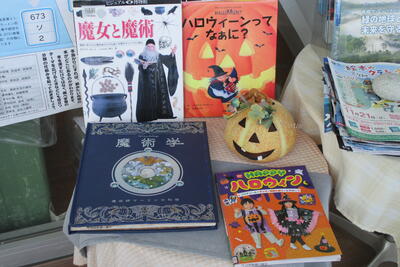 ハロウィンにまつわる本や、魔女や魔法に関する本を展示しました。『魔術学 魔術師マーリンの秘密』(ドゥルガド・A・スティール∥著 今人舎)は楽しい仕掛けがいっぱいあります。ぜひ手にとって読んでみてください。