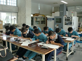 技能検定3級技術指導(MC:マシニングセンタ)が行われています。前日の旋盤の技術指導と同様に講師の先生をお招きして指導していただいています。普段も課外で勉強していますが、今回は今までに教えてもらっていない作業についても指導していただいているため、生徒達も真剣に取り組んでいます!合格目指して頑張ります(^^)/