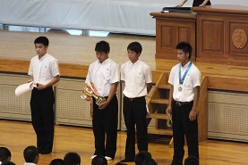 最後に表彰式が行われました。全国高校総体陸上競技男子400mで2位となったC2山本君や先日新聞にも掲載された危険物甲種に見事合格したC3田中君、大会で優勝したハンドボール部、吹奏楽コンクール(Bパート)で銀賞を獲得した吹奏楽部。そしてジュニアマイスターの認定者(ゴールド8名・シルバー44名)。多くの生徒の頑張りが見えると思います。この調子で2学期も頑張ってくれることを期待しています。