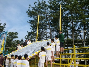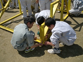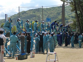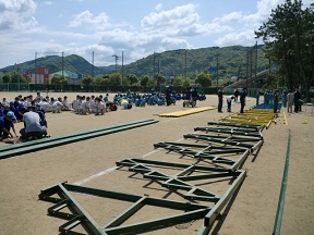 本日は団席組立を行いました。4限目に1年生が団席の場所まで運び、5限目からは3年生が組立を行うという流れで作業を行いました。今年の団席組立も無事終了しました!(^_^)