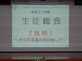 平成27年度生徒総会が行われました。今年度のテーマは「挑戦~さらなる高みを目指して~」です。挑戦項目としては、①5S活動の推進、②人権感覚を磨く、③基本的生活習慣の確立があげられました。これらの目標は天工生全員で取り組んでいくべき目標です。一人一人が高い意識をもっていきたいです。