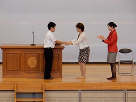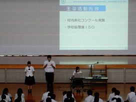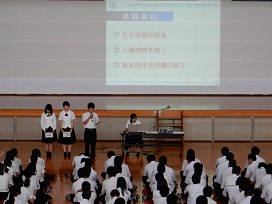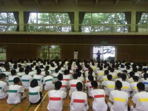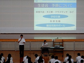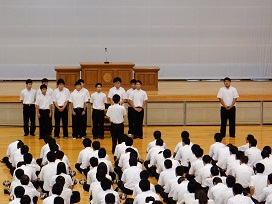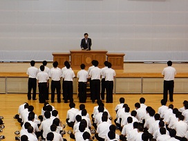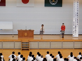 生徒総会後には壮行会が行われました。ハンドボール部が全九州県予選で2位となり九州大会出場、陸上競技部ではE3臼杵が高校総体で砲丸投げ3位となり南九州大会出場が決まっています。選手代表の生徒による決意表明があり、校長先生と生徒会長の宮﨑君から激励の言葉がありました。学校の代表として、熊本の代表として頑張ってきてほしいと思います!