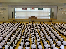本日は夏休み中の登校日です。掃除の後、体育館で全校集会が行われました。教務部・進路部・生徒指導部から夏休みの過ごし方について確認の連絡が行われました。また、総務部からは、「親と子のメッセージカード」の生徒からのメッセージが本日配布されるとの連絡がありました。ご家庭に各該当クラスのメッセージが届くと思います。生徒達の日頃はなかなか口に出して言えないメッセージをぜひご覧下さい。