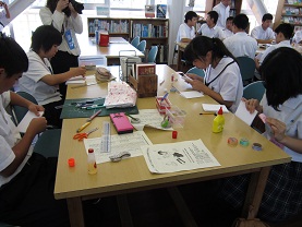 研修では午前中に、「図書館を飾る小物づくり」を3班に分かれて作業をしました。