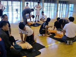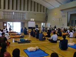 天草広域連合中央消防署 救急救助係の方々を指導者としてお招きし、救急法研修会が行われました。本来は職員向けの研修会の場ですが、各部活動の代表生徒も一緒に研修会を受けました。
