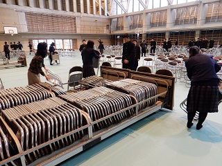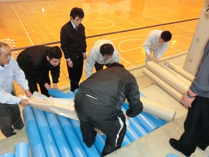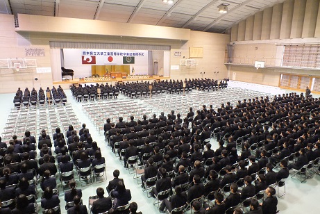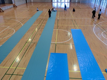 天草市民センター体育館に設けられた特設ステージで、8名の男子生徒が少ない人数の中でも、力強くエッサッサを披露していました。また、来場者の方々からもご声援を頂きました。多くの来場者がいる中、始まる前に緊張している様子でしたが、実際に始まると、堂々と披露している姿にたくましさを感じました。