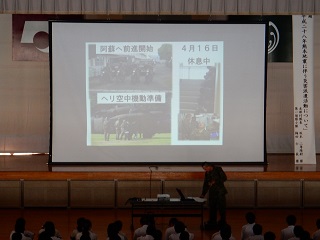 避難訓練後は、熊本地震災害講話を自衛隊の本部付隊長の坂本二等陸尉様と第一偵察小隊の梅田士長様に講話をしていただきました。熊本地震で自衛隊の方々が行われた災害派遣活動の内容についての説明をしていただき、地震から3ヶ月が経とうとしている今、改めて地震等の災害への備えの大切さも感じたところです。本日は講話をしていただきありがとうございました。