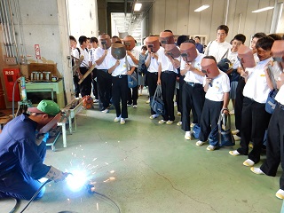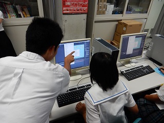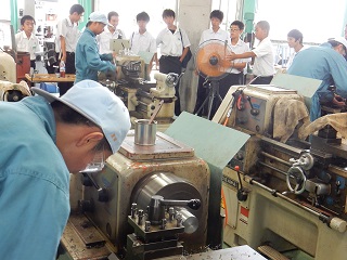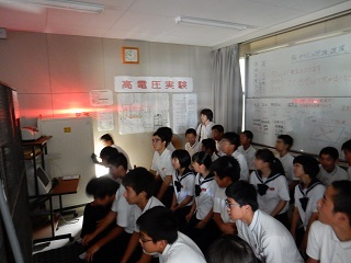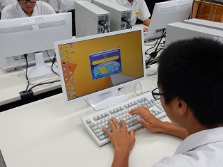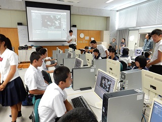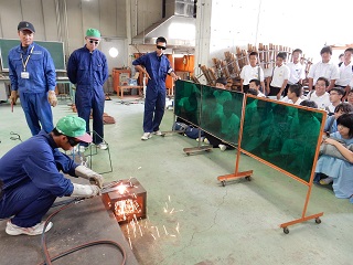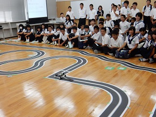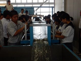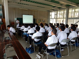 体育館でのオリエンテーション後、各科の実習の様子を見学していただきました。機械科・電気科・土木科・情報技術科では、ビデオやパワーポイントを用いて説明したり、実際に作業の様子を見てもらったり、中学生に作業を体験してもらったり等それぞれの特徴を出し、中学生に少しでもわかりやすいようにと工夫しながら天工生たちが説明してくれていました。