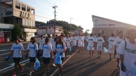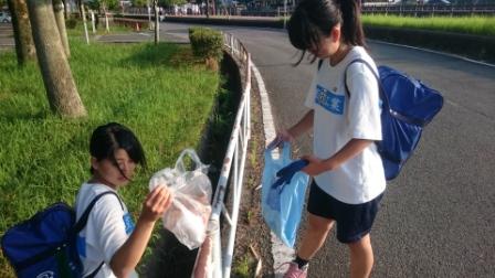 約60名の生徒が大矢崎緑地公園を出発し、歴史民俗資料館や天草警察署一帯のゴミを、約1時間かけて拾い歩きました。祭りの次の日ということもあり、道には露店の容器やタバコの吸い殻が多く捨てられており、生徒達は一つずつ丁寧に拾っていました。華やかな花火大会が多くの人の協力で成り立っていることを知ると同時に、自分のマナーについても振り返ることができたのではないでしょうか。