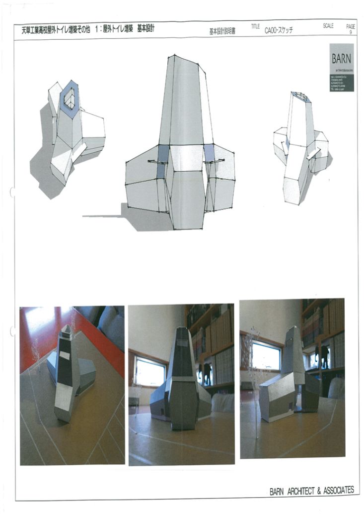 本校は、外来の方が利用する屋外トイレがなく、来校者に御不便をおかけしていました。このほど要望を認めていただき、ソフトテニスコートの横に熊本県土木部建築住宅局営繕課が主管する屋外トイレの新築工事が始まりました。引き続き、土木科実習棟1階部分に屋内トイレの新築工事が始まる予定です。なお、竣工予定は12月16日です。 工事範囲は囲いがしてありますが、生徒の皆さんは危険ですから近づかないでください。 ↑ 外トイレの完成予想図です。 テトラポッドの形をしています、なかなか斬新なデザインになりそうです。 *許可なくデザインの無断使用、無断転用を禁じます。 |