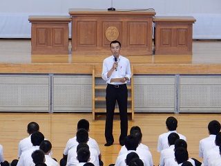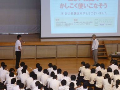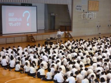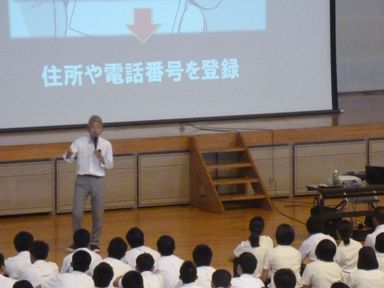 | 本日の6限目に情報教育講演会が体育館で行われました。 講師の先生にはKDDIスマホ・ケータイ安全教室から瀬町俊彦先生をお招きしました。 高校生が被害者となりそうな大変身近な例を挙げ、何が問題なのかを生徒たちに話し合わせながらわかりやすく御講演いただきました。また、ちょっとしたことで加害者になりうることもあり、使い方を考える必要があると御指導いただきました。 最後に図書委員長の濵﨑航祐君が生徒を代表して謝辞を述べました。その話から、生徒たちも各々が持っているスマートフォンは非常に便利ではあるが、スマートフォンとのかかわり方を間違うと自分や周りを嫌な目に合わせることもあるとうことがよくわかってくれたようでした。 |