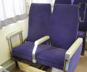 大まかな諸元は次のとおりです。車両重量30t、エンジン最大出力250馬力(1900rpm)、最高速度95km/h、定員98名、車長17m。オールステンレスの車体で、台車や変速機等の様々な部品に廃車発生品を採用し、ドアや空調設備にもバスの部品を使用するなど徹底的な軽量化やコストダウンが図られています。実は知る人ぞ知る有名な事実があります。この座席は新幹線0系のおさがりなのです!