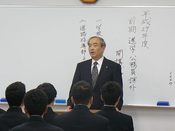 4月17日(月)、3年生34人、2年生26人、計60人が出席し、進学・公務員課外の開講式が行われました。校長先生から「自分の夢や目標に向かって、しっかり励んで下さい。進路希望実現への歩みは、毎日やることで力がつきます。自らの意志で受講するわけですから、遅刻・欠席をすることなく、頑張りなさい!」と、激励されました。進路指導部としてもバックアップしていきますが、『学問に王道無し』ですので、予習・復習などの家庭学習を大切にしていきましょう。