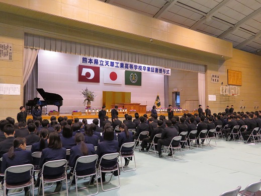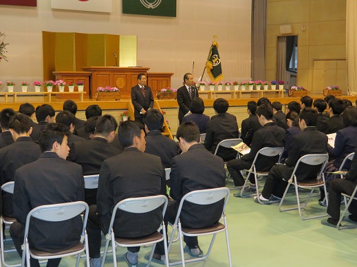 2月28日(水)に平成29年度の同窓会入会式が行われました。式では、同窓会副会長の江﨑平治様と鎗光秀孝様から温かい歓迎の言葉をいただきました。その後事務局から役員紹介と会則説明を行い、最後に第53期卒業生の代表者紹介を行いました。