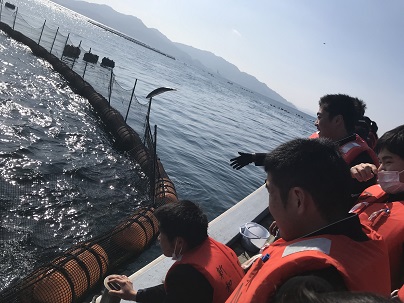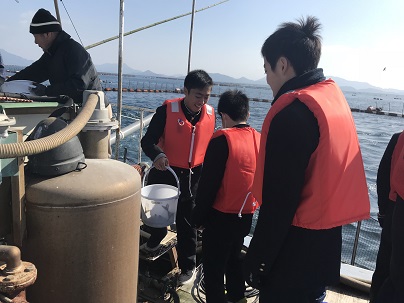 本校からは17名の生徒たちが参加しました。新和町沖合にて行われている、マグロ養殖のいけすを船の上から見学し、えさやり体験もさせて頂きました。