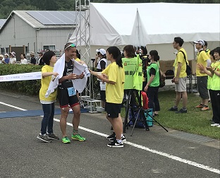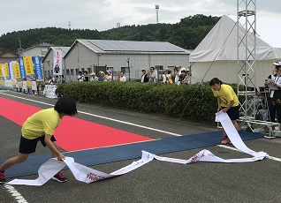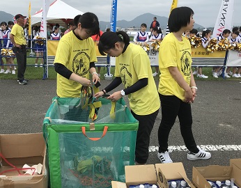 スタート地点(本渡海水浴場)・ゴール地点(大矢崎緑地公園)にて給水、ごみの回収、テープ引きやアンクルバンドの回収等のお手伝いをしました。