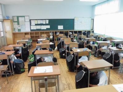 地震が発生し、津波警報が発令されたという想定で、まず生徒は机の下に身を隠すなどの措置をとった後、