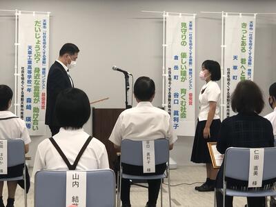 一般の方も含め1000点を超える応募作品の中から、最優秀賞に本校1年生の森﨑瑛稀君、奨励賞に本校1年生の山田麻花さんが選ばれ、馬場天草市長より表彰されました。(入賞者6名のうち2名が本校)